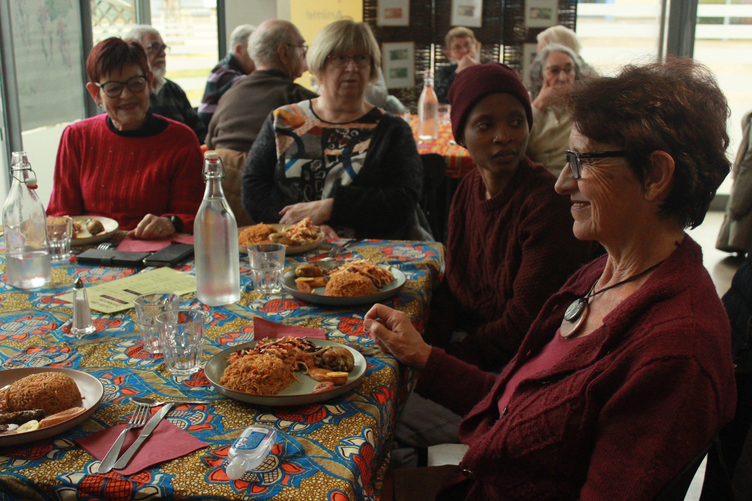 Et ce mois passé, il s’est déroulé sous les couleurs et saveurs du Nigeria ! Grace nous a présenté son pays d’origine à travers une belle présentation et de nombreux objets rapportés de chez elle : vêtements du quotidien, monnaie locale, ustensiles et décorations en bois… Vous étiez également nombreux et nombreuses à venir, une fois de plus, au repas multiculturel : le rendez-vous des curieux·ses de nouvelles saveurs chaque dernier mardi du mois. Une fois de plus Grace s’est retroussée les manches avec son amie Edith et avec l’aide de stagiaires et salariés pour concocter un plat typique du Nigeria : le jollof rice, accompagné de bananes plantains et suivi de puff puff, ces petits beignets sucrés aromatisés à la cannelle.